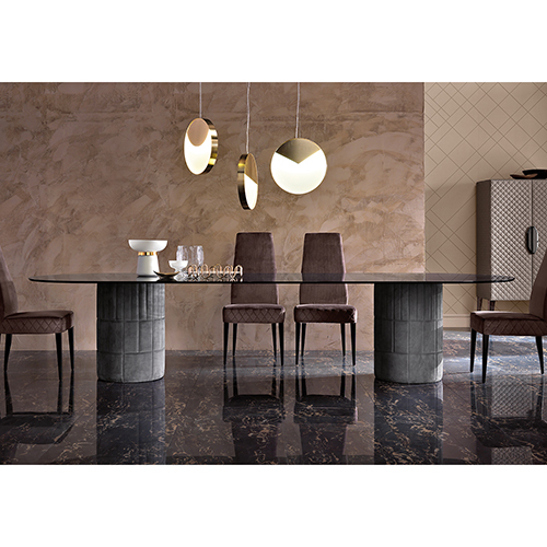Tavolo tondo con basamento in legno massello imbottito, rivestito in pelle. Piano in vetro fumè temperato da 12 mm bisellato e retroverniciato, o in vetro bronzo stratificato da 16 mm bisellato e retroverniciato.