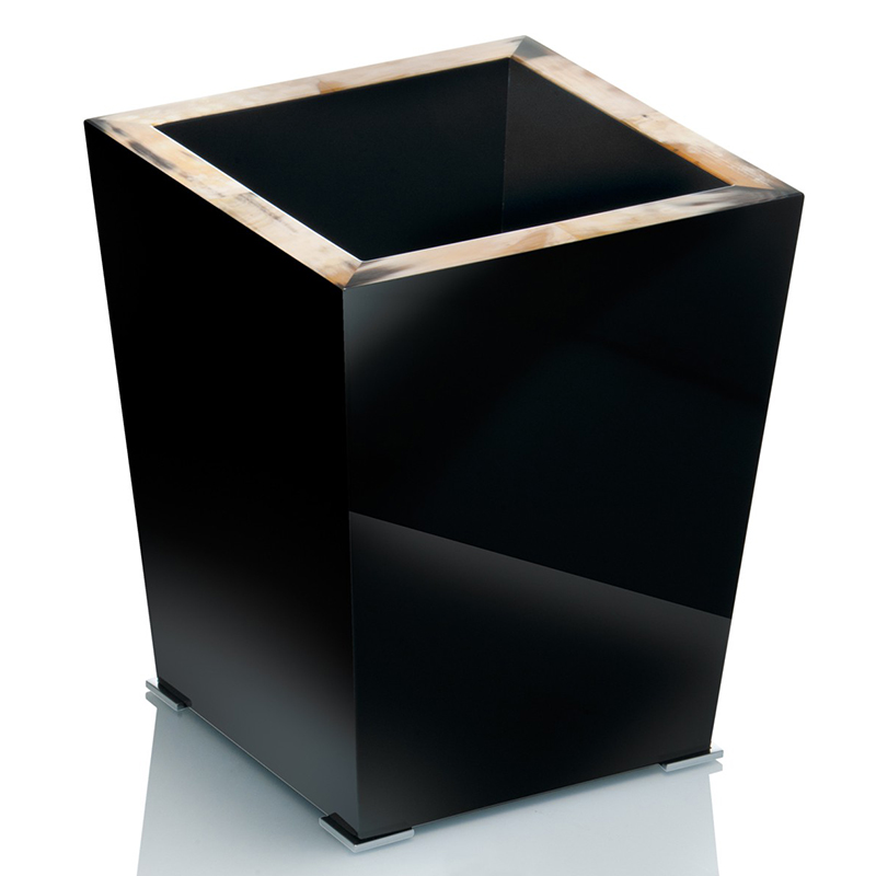 Cestino gettacarte in corno scuro e legno laccato lucido colore nero. Piedini in ottone cromato.