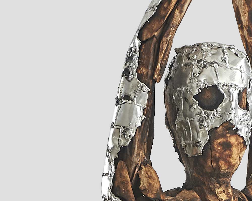 Scultura in legno effetto bruciato e fusione di alluminio in finitura naturale.