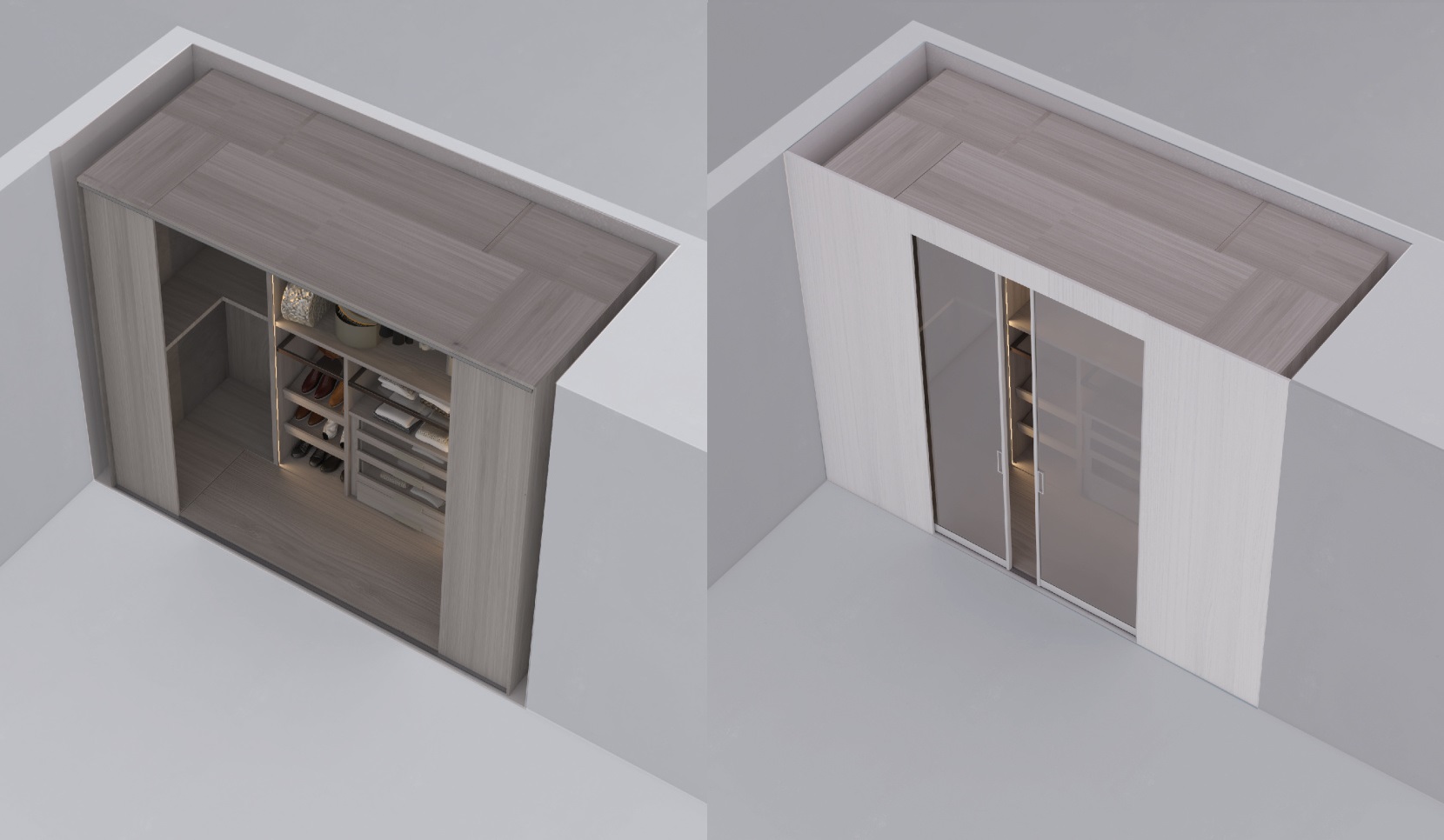 “Stand up” self-supporting Walk-in Wardrobe.Fixed frontal panels in olmo perla laminate finish.