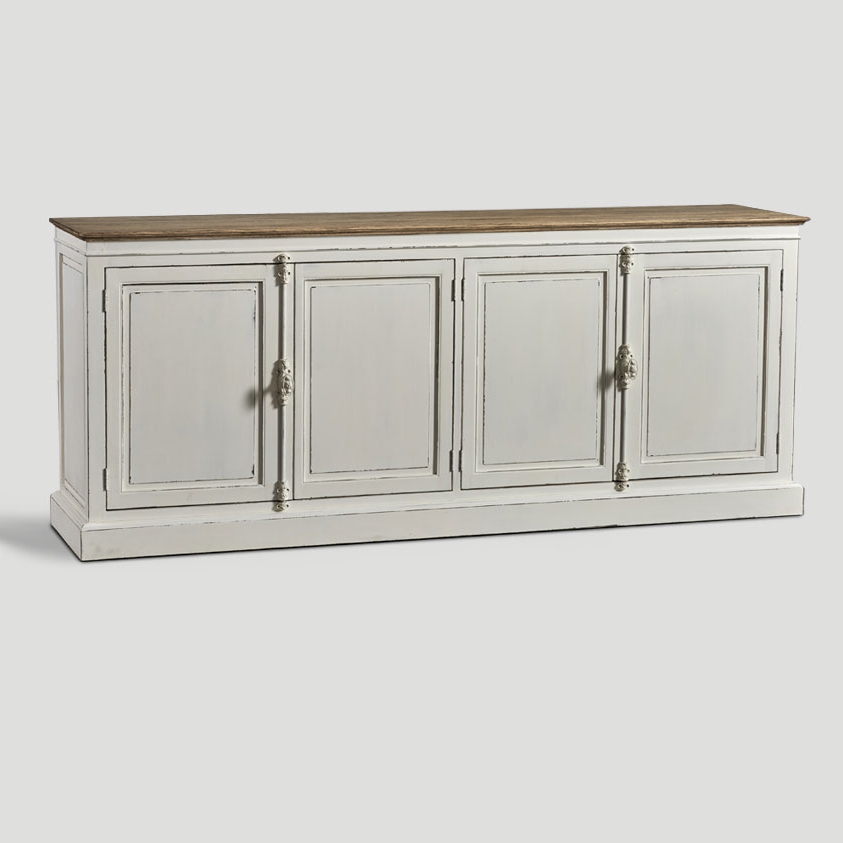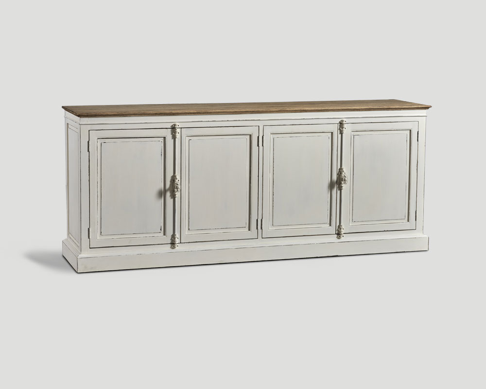 Credenza 4 porte, in legno finitura Bianco Vissuto, top in rovere finitura Vintage chiaro