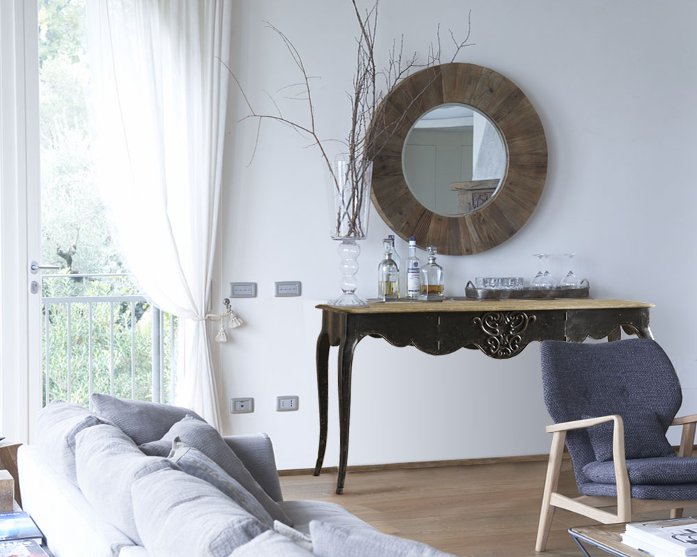 Consolle con vano apribile centrale, in legno finitura laccata e cerata a pennello color Lavagna, top in rovere finitura Vintage Chiaro