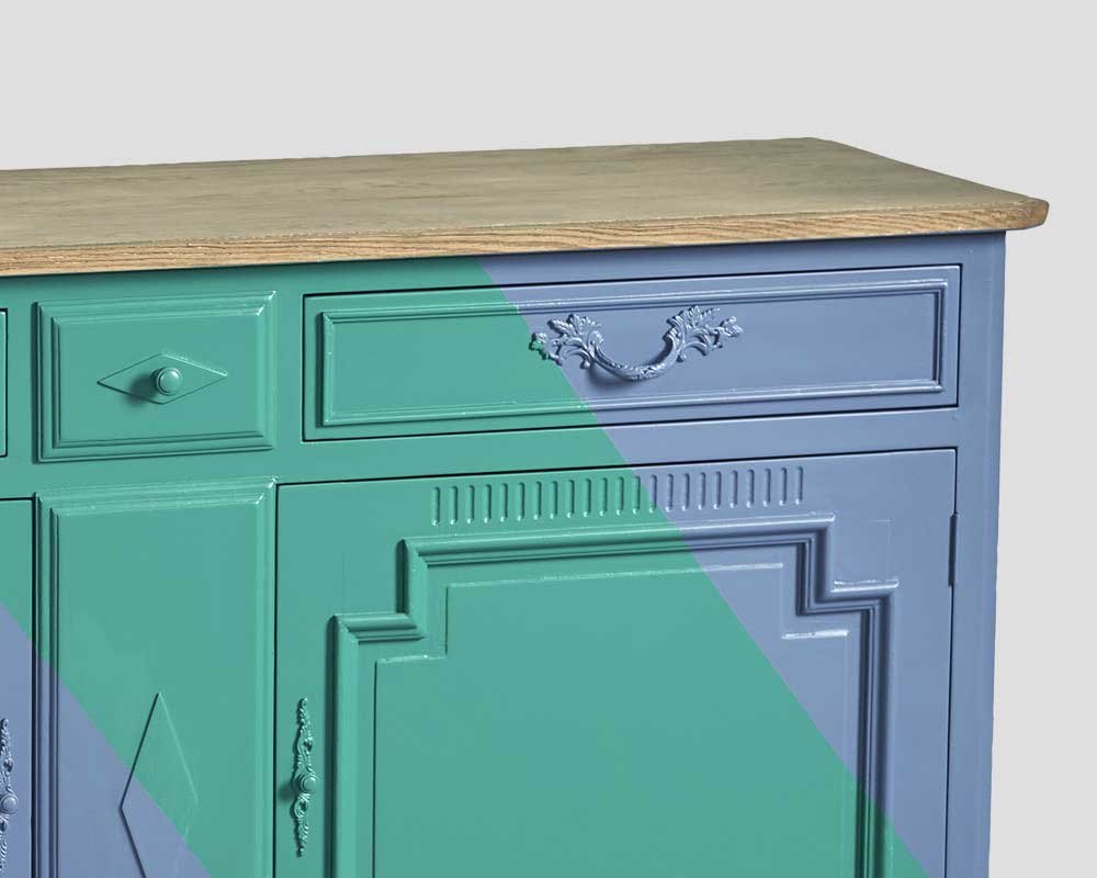 Credenza 2 porte + 2 cassetti, in legno finitura Blu Jeans e Verde Smeraldo, top in rovere finitura Vintage Chiaro
