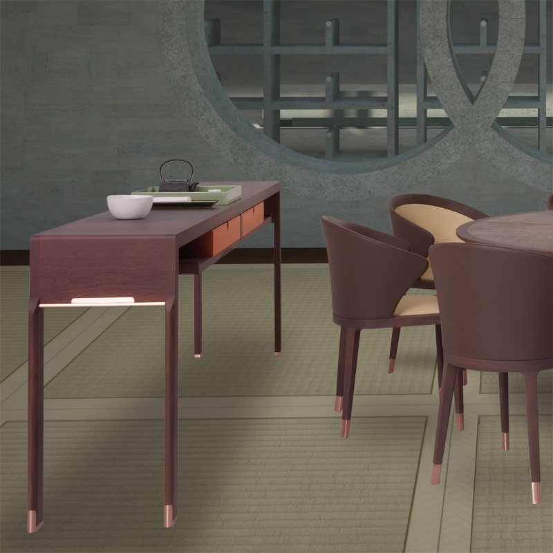 Sucupira wooden frame, leather drawers, natural stone veneer inset, copper finish metal points.