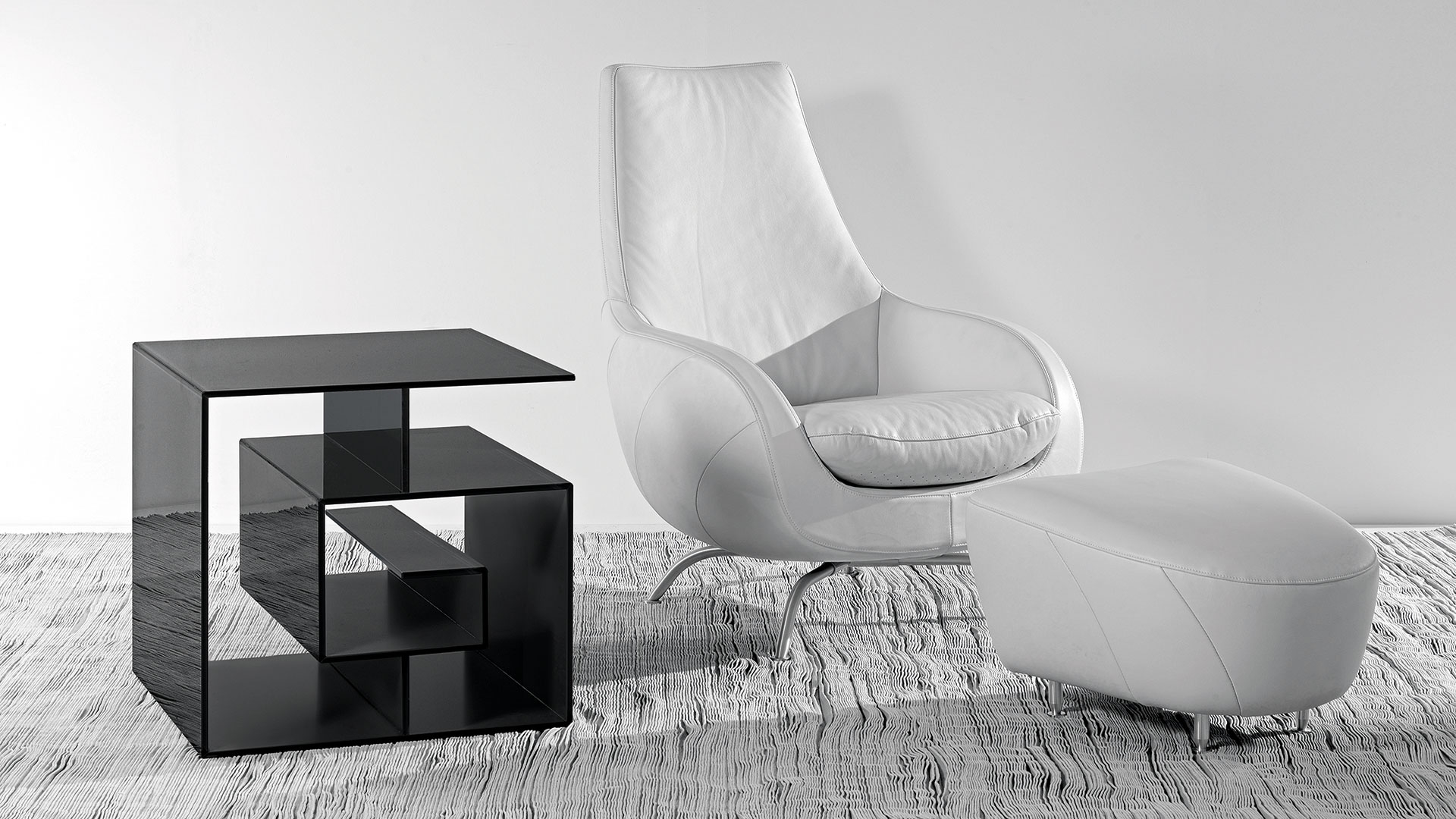Console composed by 10 mm thick transparent or Black Pearl glass sheets in a spiral shape.