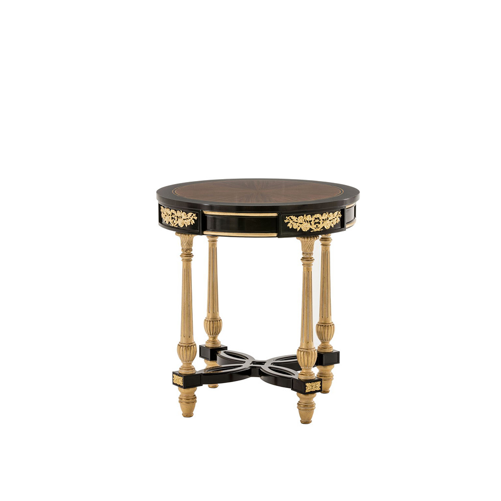 Louis XVI style. Wooden structure with ebony details. Solid wood sculptures in gouache gold leaf finish. Metal decorations in French gold bath finish. Top in ebony and Persian walnut briar. | Размеры | |