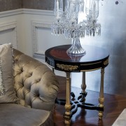 Louis XVI style. Wooden structure with ebony details. Solid wood sculptures in gouache gold leaf finish. Metal decorations in French gold bath finish. Top in ebony and Persian walnut briar. | Размеры | |