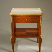 One drawer. Wooden structure, bois de rose and polychrome inlays. Brass decorations and feet with French gold bath finish. "Delicate Cremo" marble top.