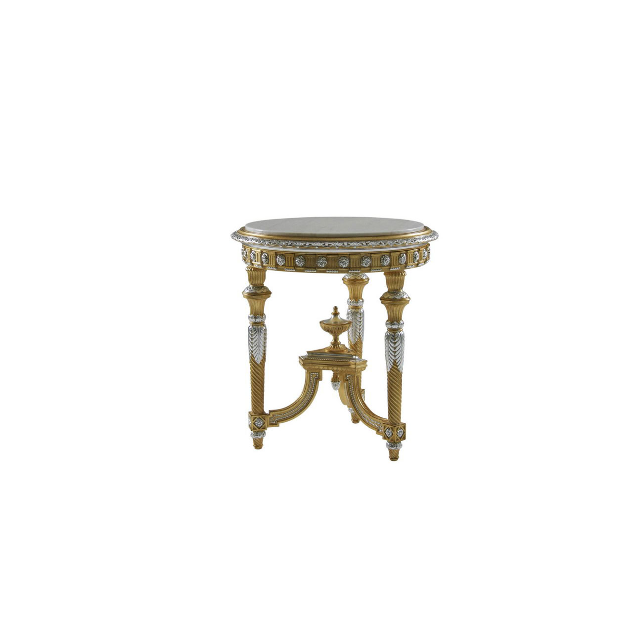 Neoclassic style. Solid wood carvings. Finish: gouache gold leaf  and details in silver leaf with patina. Marble top Calacatta Statuario mm. 20