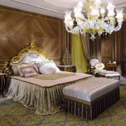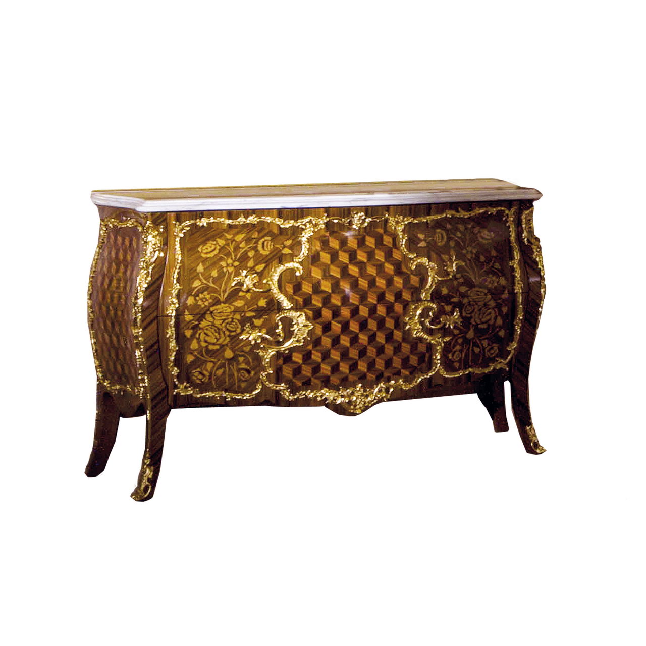 Two drawers. Wooden structure, rosewood and polychrome inlays. Brass decorations with French gold bath finish. "Delicate Cremo" marble top.