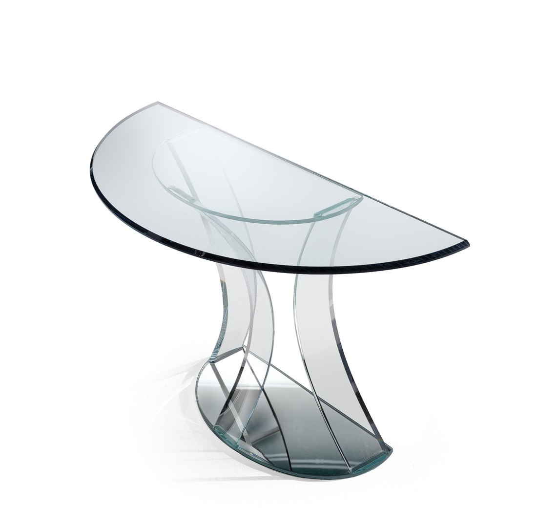 Console with base in antiqued dark brass finish on oval plinth in smoked mirror glass. Top in 15mm thick transparent glass or extra clear glass.