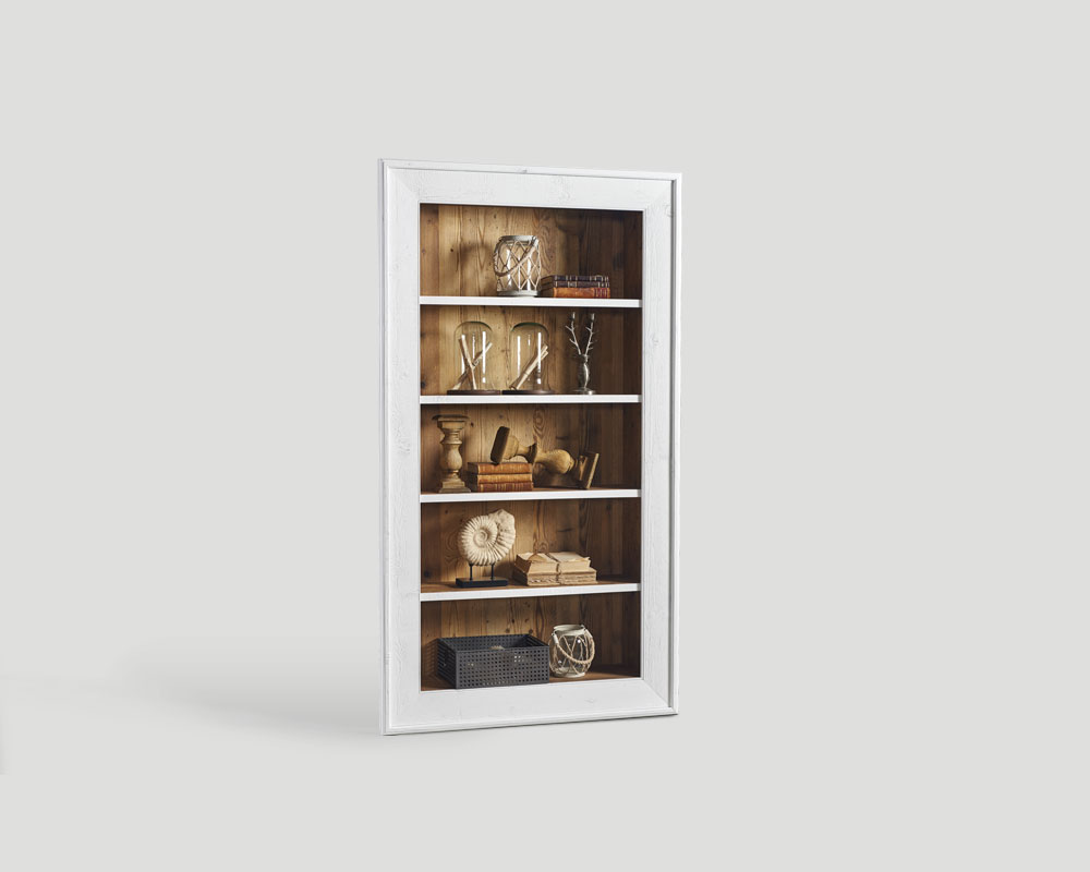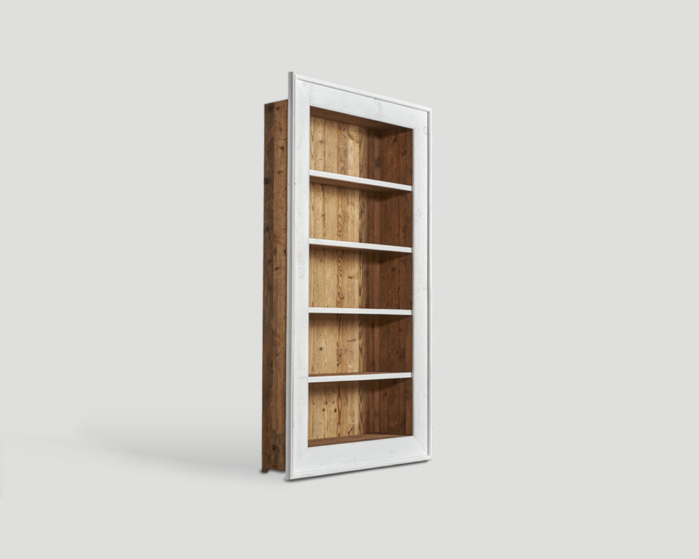Libreria in legno vecchio riciclato con interni finitura Naturale e frontale laccato e cerato a pennello color Bianco