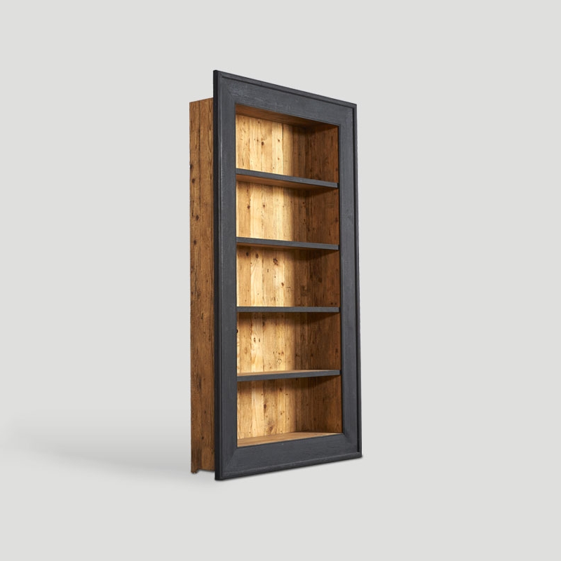 Libreria in legno vecchio riciclato, interni finitura Naturale, frontale laccato e cerato a pennello color Lavagna