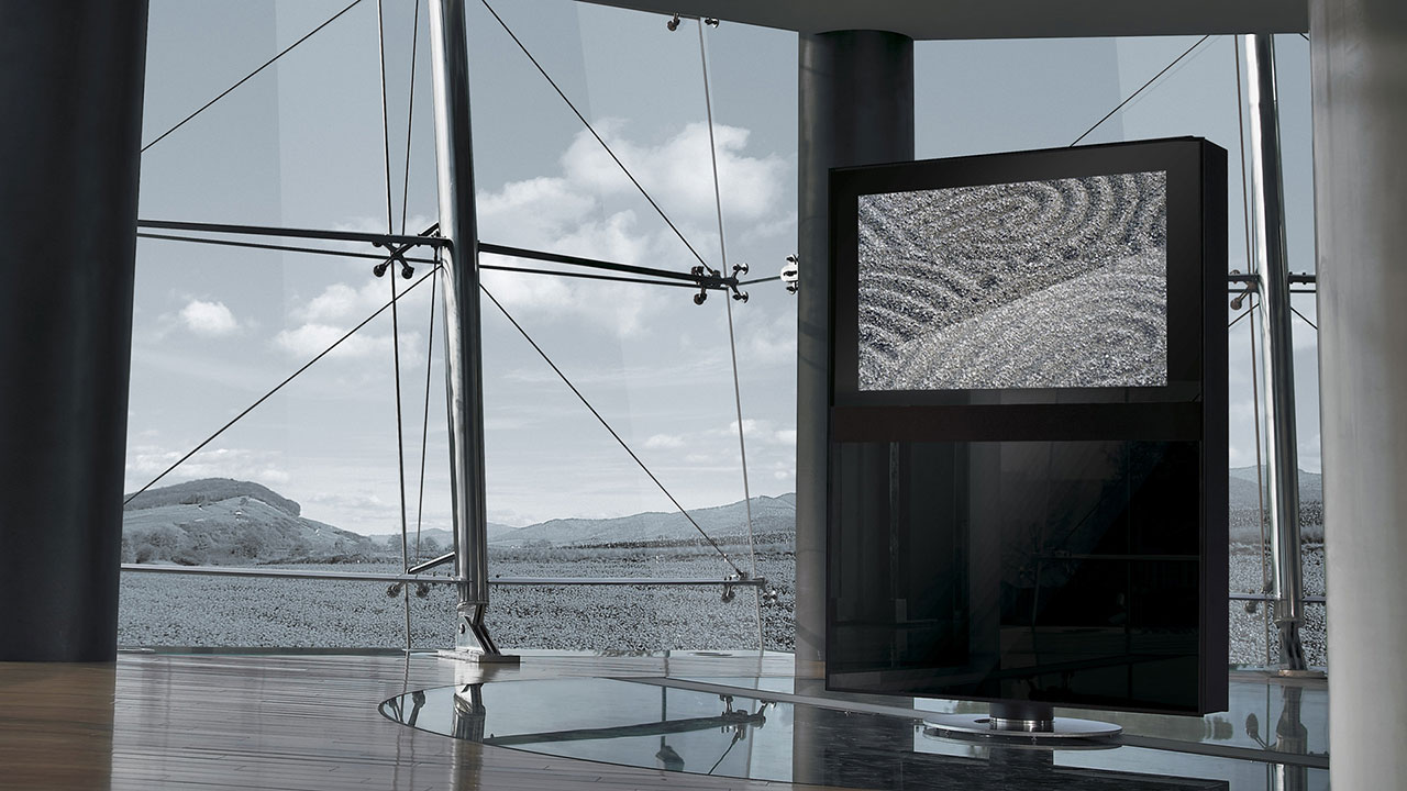 TV-stand for LED, LCD and Plasma televisions with aluminium structure on a turning base in brushed steel. Mirror back and door in dark-grey glass with black serigraphy. Optional available: storage space, lycra band on the door and electrical engine with remote control.