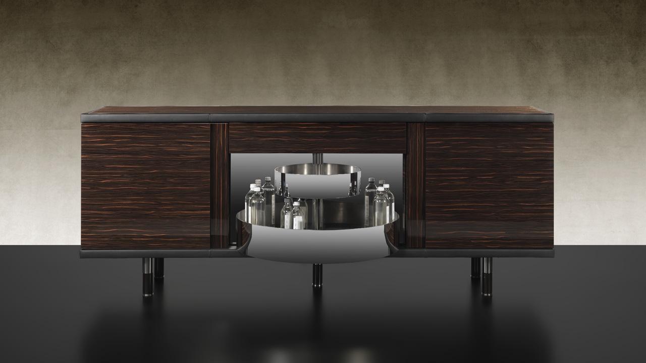 Buffet con struttura in noce Canaletto, rovere Henné o in ebano lucido. Piano di finitura disponibile in noce Canaletto, rovere Henné, ebano lucido, vetro acidato verniciato, vetro Mesh, vetro-marmo o in marmo. Bordi di piano e fondo rivestiti in pelle. Piedini in acciaio e legno Versione bassa con un’anta a battente con ripiano interno, un vano centrale con cestello girevole portabottiglie in acciaio e vano destro con tre cassetti (modello A). Versione alta con due ante a battente con ripiano interno, un vano centrale con cestello girevole portabottiglie in acciaio e un cassetto (modello B).