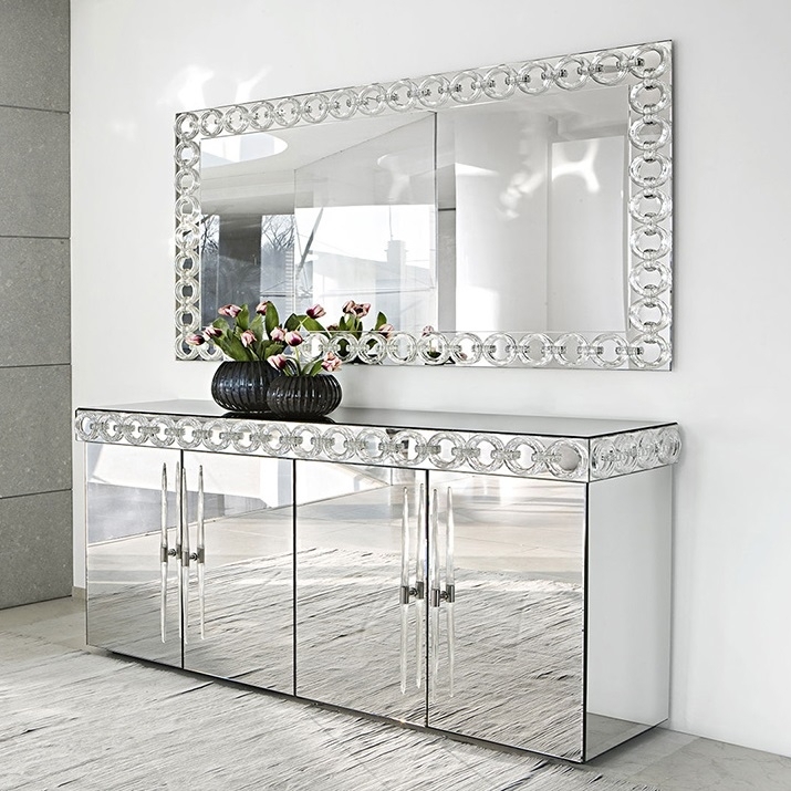 Sideboard with external covering in mirror glass or in lacquered glass. Decoration with transparent, gold or coloured Murano glass rings. Internal back and shelves in cedar-wood. Optional Murano glass handles and LED lighting on the decoration.
