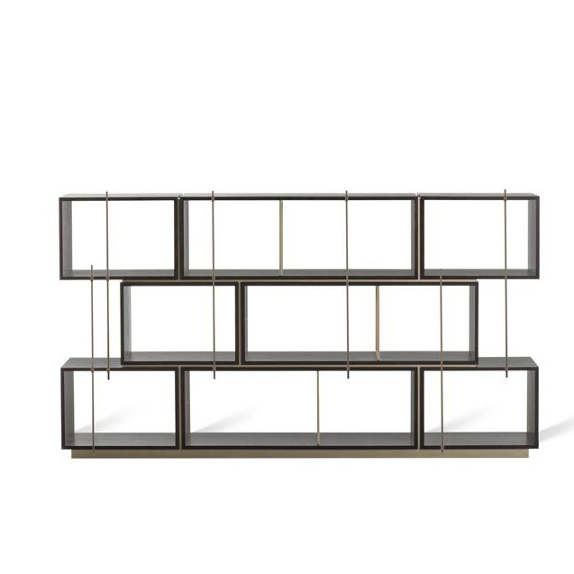 Bookcase with structure in wood and bronzed lacquered decorative bars.