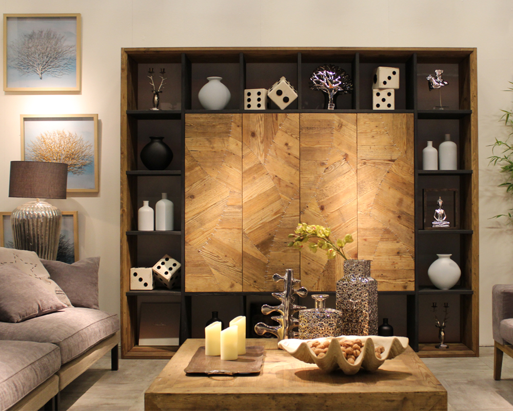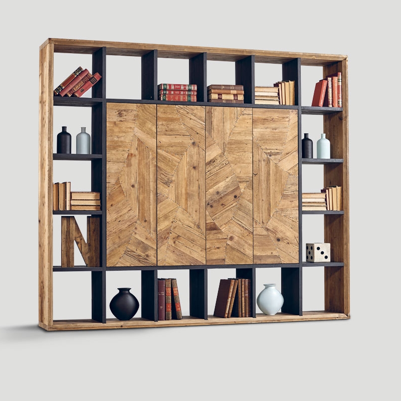 Liberia 4 porte, in legno vecchio riciclato finitura Naturale, interni laccati e cerati color Lavagna con rifiniture frontali in metallo