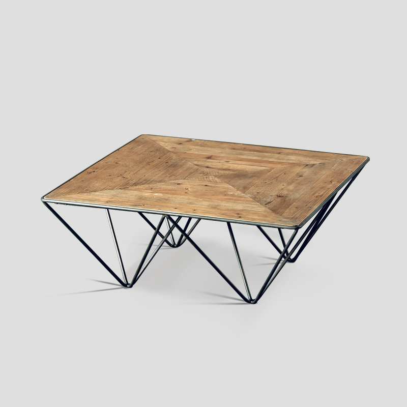 Tavolino quadrato con struttura in metallo finitura Ferro Brunito, top a quadrotta in legno vecchio ricilato finitura Naturale