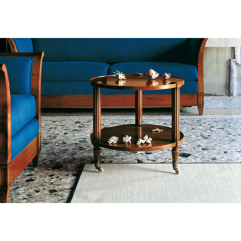 Tavolino rotondo in legno di ciliegio a due piani sovrapposti. Gambe intagliate e piedini torniti su ruote.