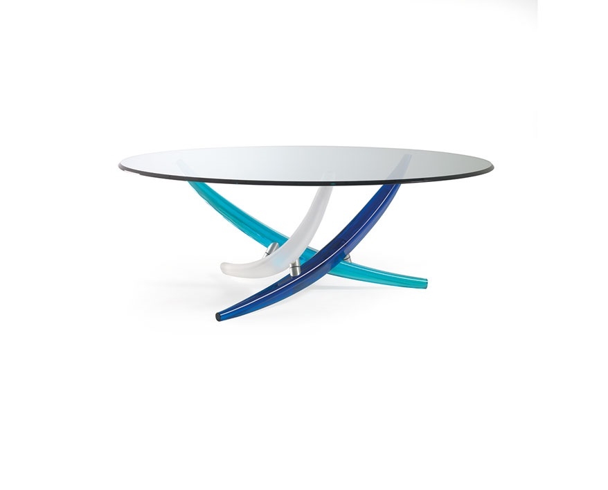 Coffee table with Murano glass base available in the combination of blue, turquoise and white sandblasted or in Rugiada, gold & Murrine or Calcedonio finish. Glass top 12 mm thick.
