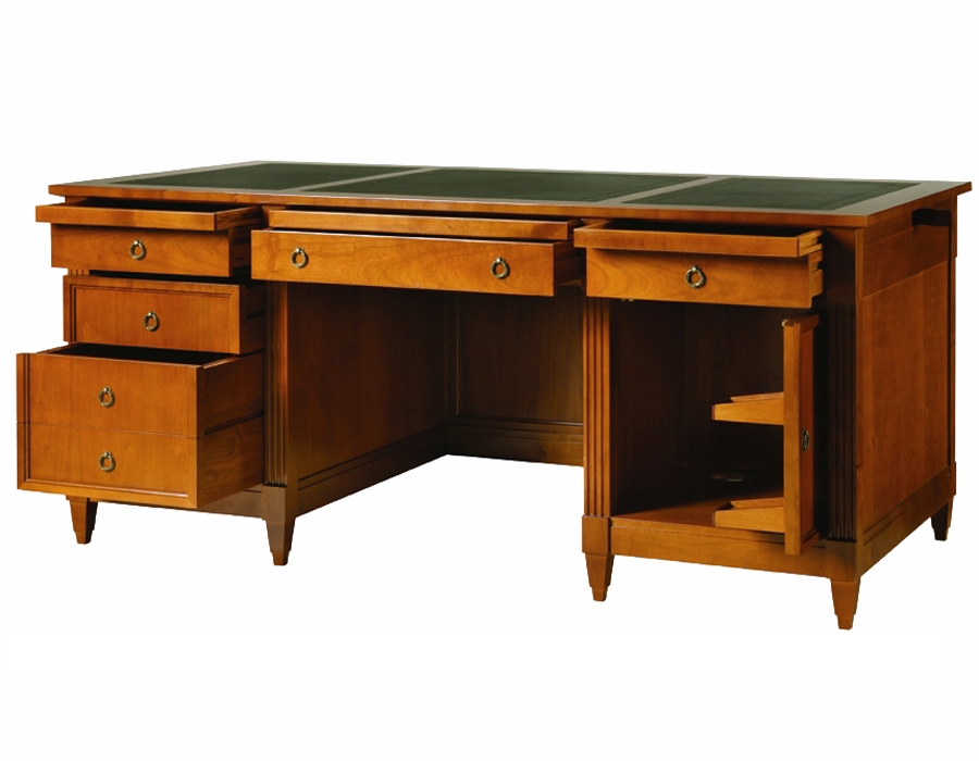 Scrivania in legno di ciliegio con pregiati rivestimenti in pelle sul piano. 4 cassetti, 1 cassetto porta schede e vano porta pc.