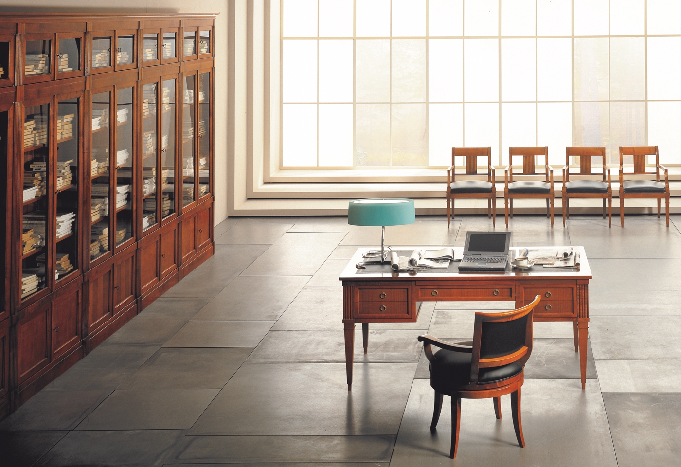 Scrivania in legno di ciliegio con pregiati rivestimenti in pelle sul piano, 5 cassetti e 3 cassettini segreti.