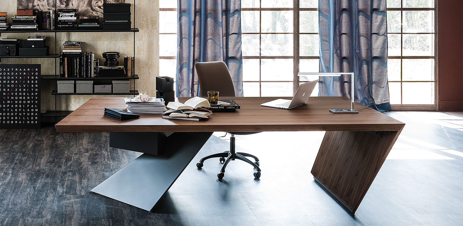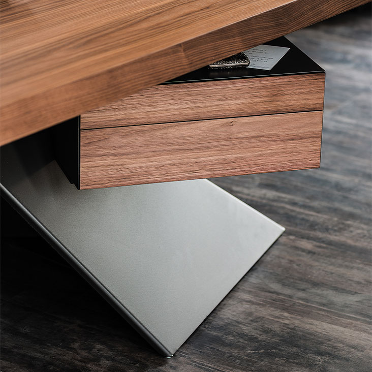 Desk with drawers in Canaletto walnut (NC), Heritage oak (HR) or open pore matt black (R73) oak. Leg in graphite (GFM69) embossed lacquered steel. On version 215x100 the drawer can be fixed on both sides of the desk, on version 260x120 it can be fixed only facing the shortest side.