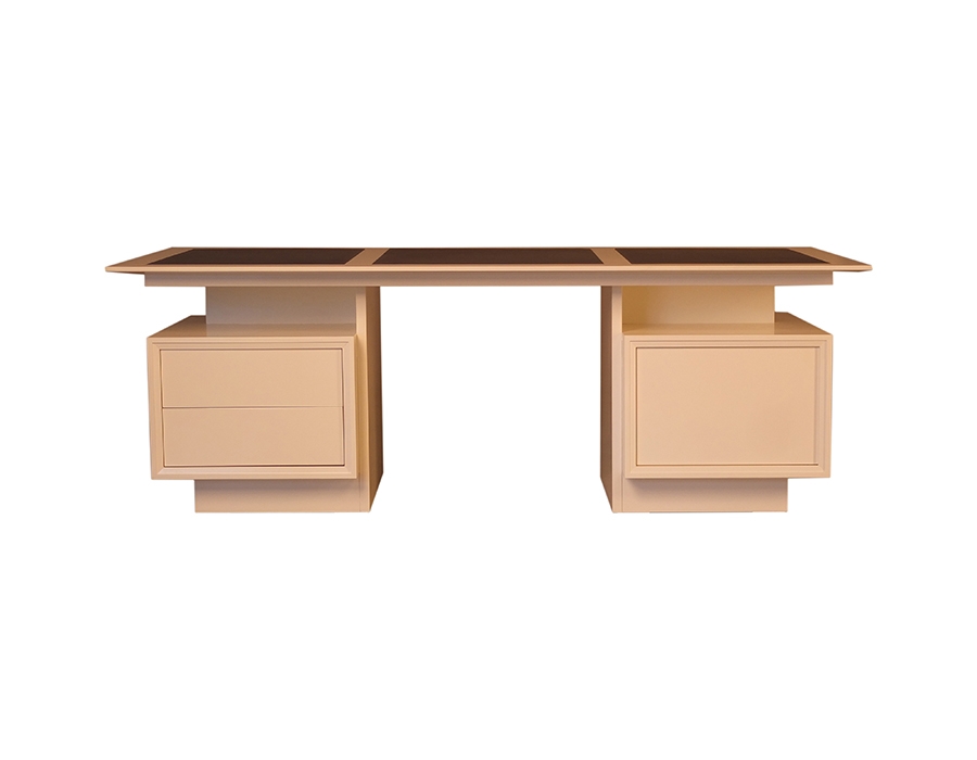 Scrivania bifacciale in legno di ciliegio con due basamenti che racchiudono ampi contenitori chiusi da ante e cassetti a scomparsa. Piano con pregiato rivestimento in pelle.