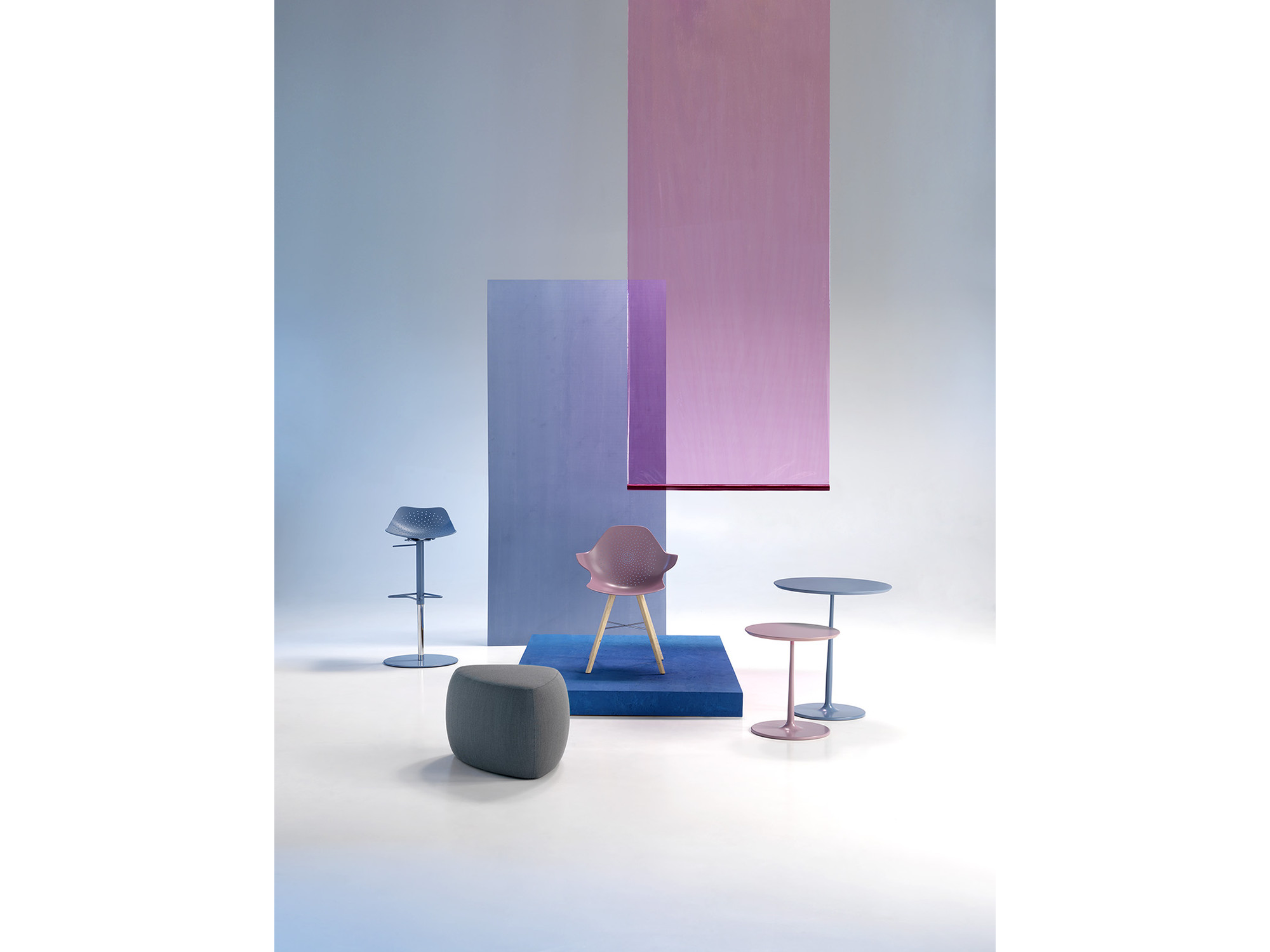 Aluminium strength assumes a new aesthetic lightness. Klera collection answers to new ways of living during mealtimes, often consumed on the balcony, in the kitchen or at the restaurant. Available also with upholstered pad, Klera stools are comfortable, functional and refined, ideal for both contract and residential contests.