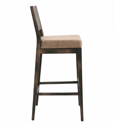 Sgabello in stile contemporaneo con struttura in faggio e schienale tamburato. L'imbottitura è realizzata su pannello in truciolare il quale è rivestito, al di sotto, da una telina in TNT (tessuto non tessuto) di grammatura 100.
