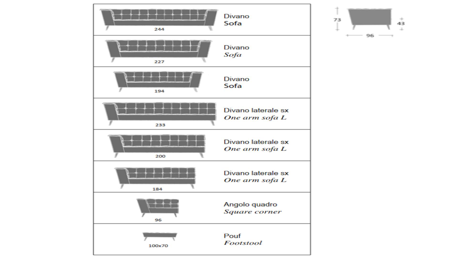 Struttura in abete e multistrato. Molleggio incrociato con cinghie elastiche rinforzate e rivestite. Imbottitura in poliuretano espan-so indeformabile ad alta densità differen-ziata. Trapunta con cuscinetti indipendenti di poliuretano rivestiti in falda acrilica. Piedi in metallo verniciato antracite. Solid fir-wood and plywood structure. Support with interwoven elastic webbing, completely covered and reinforced. Padding: different high density non deforming polyurethane foam. Quilt with polyurethane foam little loose cushions, coated with acrylic fiber. Feet: anthracite