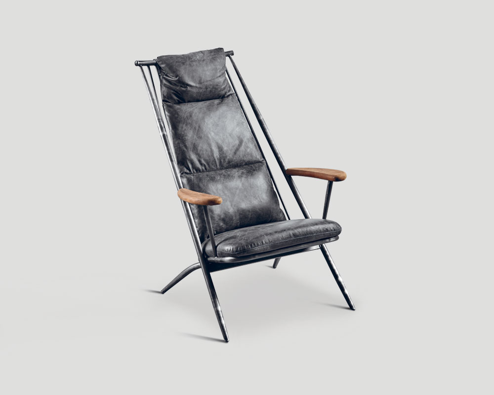Poltrona in vera pelle, rivestimento color Ebano Chiaro, struttura in metallo color Ferro Naturale con braccioli in legno