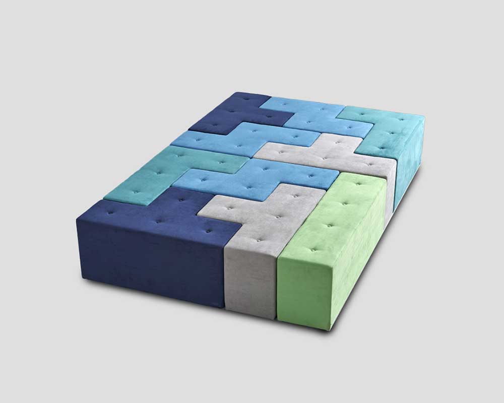 Pouf componibile 10 elementi, struttura in legno, imbottito e rivestito con tessuto multicolor.