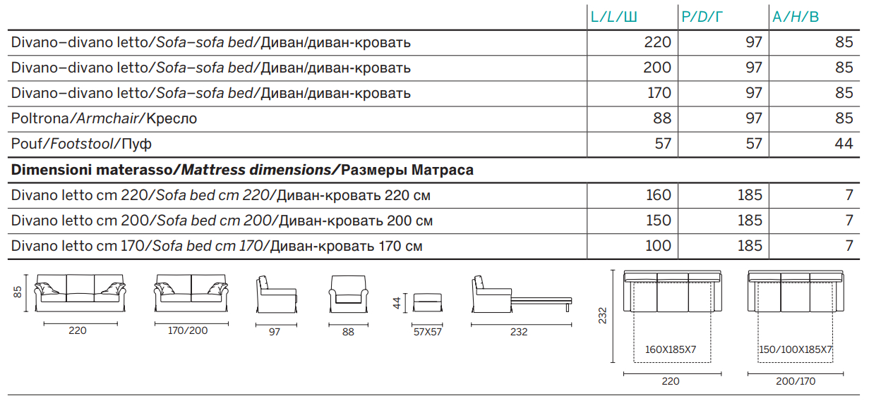Divano tre posti in tessuto, con struttura in legno. Imbottitura in poliuretano espanso indeformabile a densità differenziata. Piuma nei cuscini schienale e bracciolo. Completamente sfoderabile. Piedini in legno. Possibile inserimento del letto con rete a doghe nei divani 2 e 3 posti. Wood frame. Seat cushions in different density non deformable polyurethane foam, covered with acrylic batting. Back and armrest cushions padding in feather. Interwoven elastic webbing suspension. Only fabric covering available. Fully removable fabric slipcover. Three fold slat bed base.