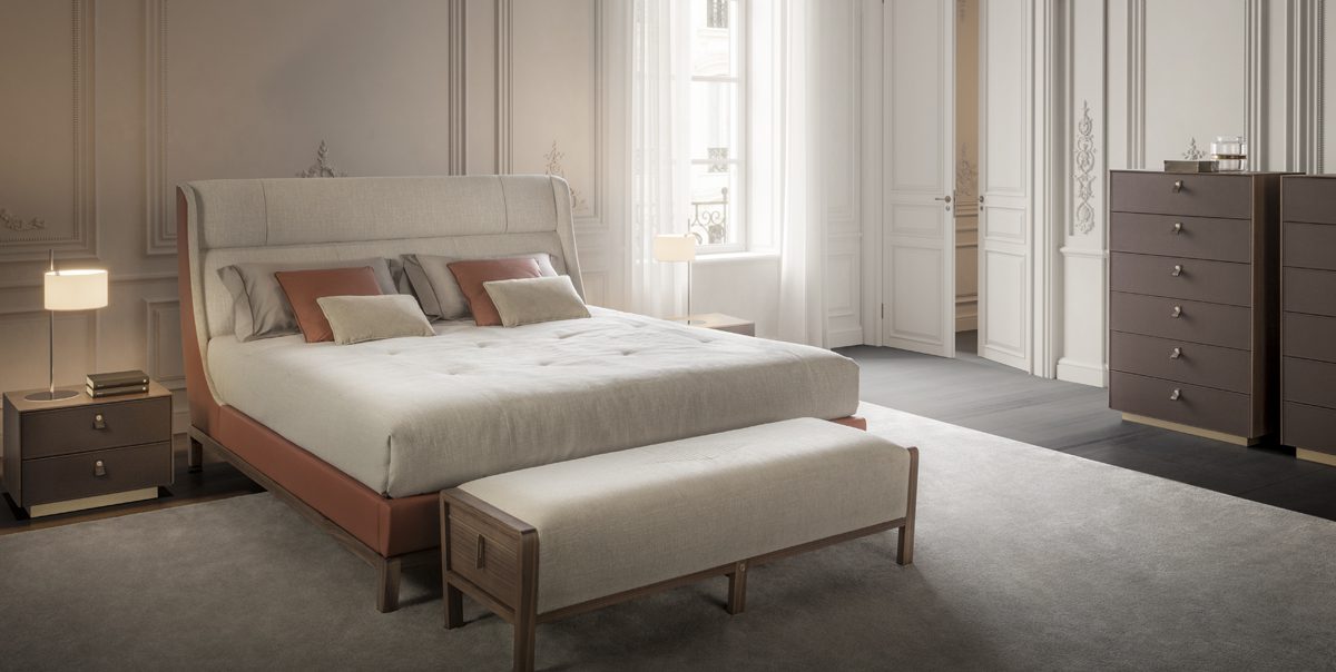 Letto con struttura in legno e rivestimento in tessuto o pelle.