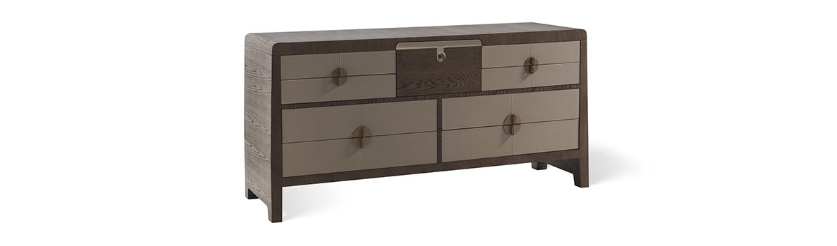 Comò in legno con inserti cuoio e maniglie laccate color metallo bronzato.