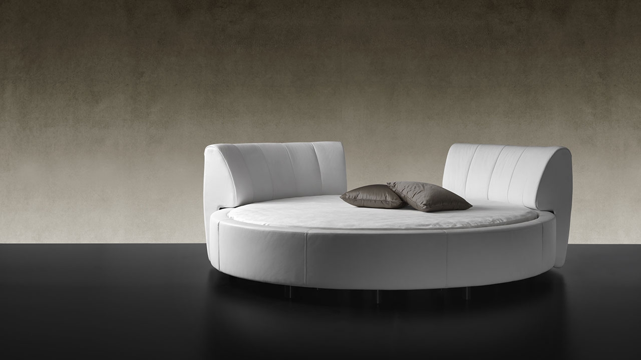 Round bed padded and upholstered with leather. Available with single fixed headboard or with double headboard with 360° rotating mechanism. Wooden platform included.Letto rotondo con rivestimento in pelle. Disponibile con testiera singola fissa o doppia con meccanismo di rotazione girevole a 360°. Supporto in legno per materasso compreso.