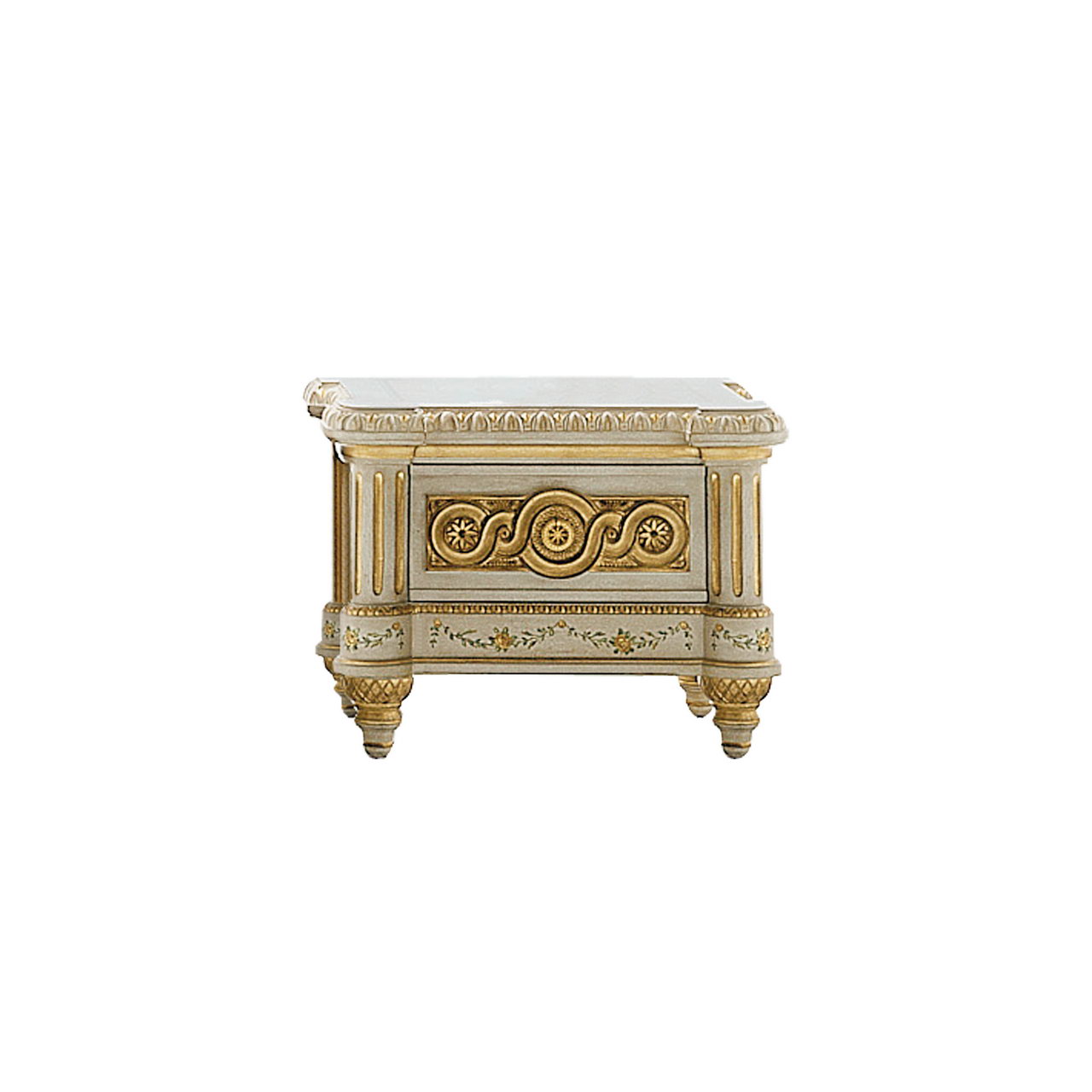 One drawer. Finish: distempered lacquer with marble imitation decorations, gold leaf and patina. French gold bath brasses.