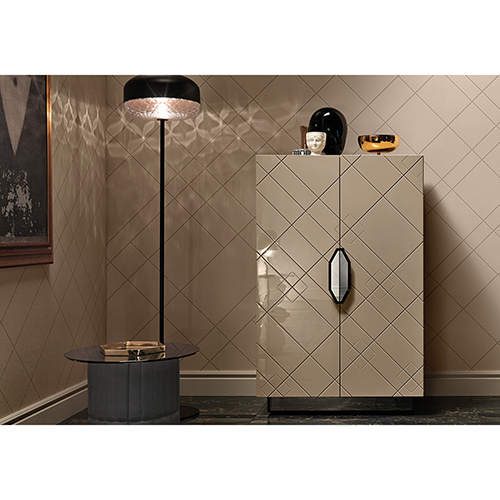 Madia composta da struttura ed ante in legno inciso e laccato lucido. Cassetto interno con frontalino in legno laccato lucido. Maniglia in vetro semiriflettente sagomato e bisellato. Zoccolo in legno ricoperto di vetro semiriflettente.