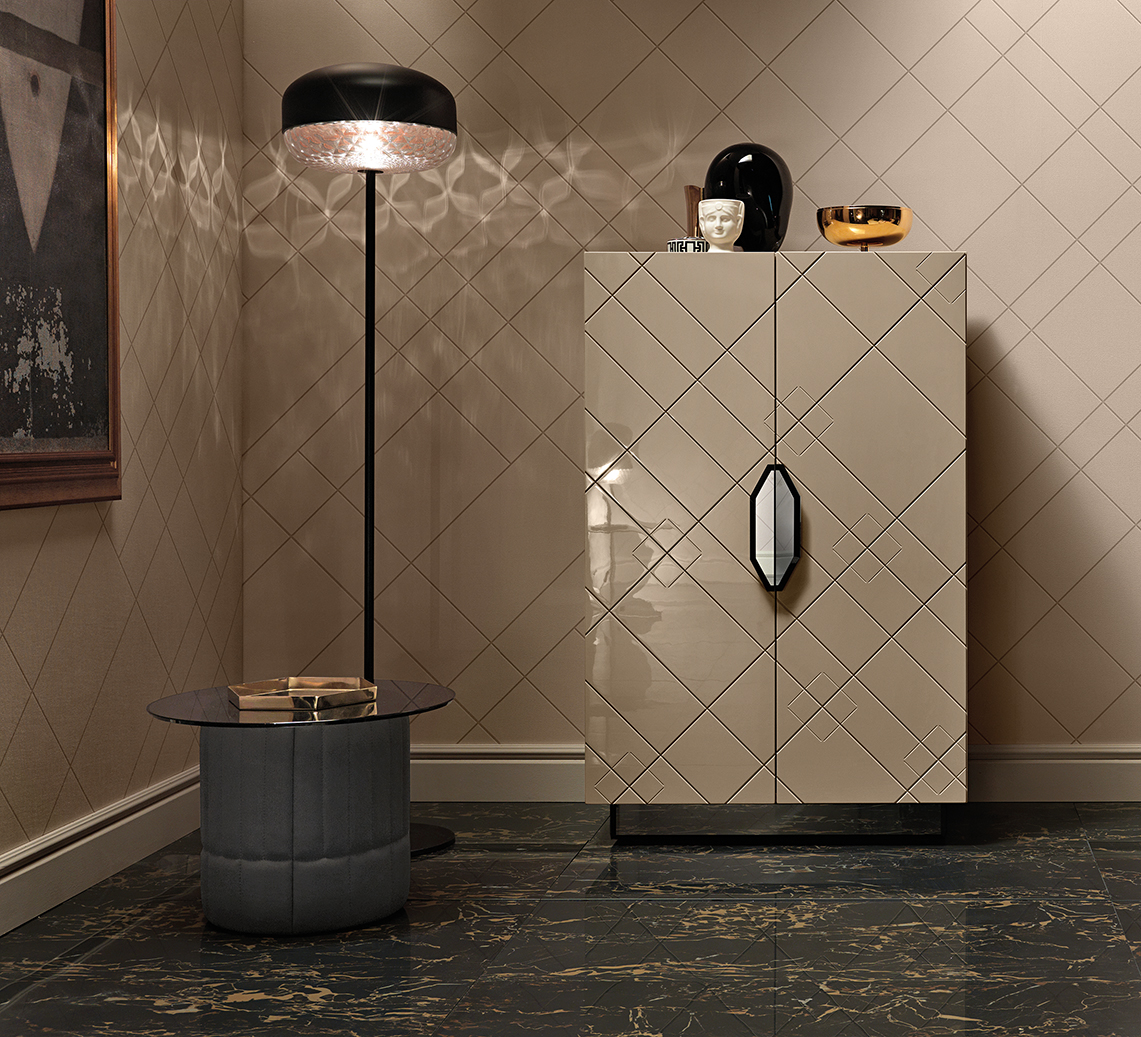 Madia composta da struttura ed ante in legno inciso e laccato lucido. Cassetto interno con frontalino in legno laccato lucido. Maniglia in vetro semiriflettente sagomato e bisellato. Zoccolo in legno ricoperto di vetro semiriflettente.