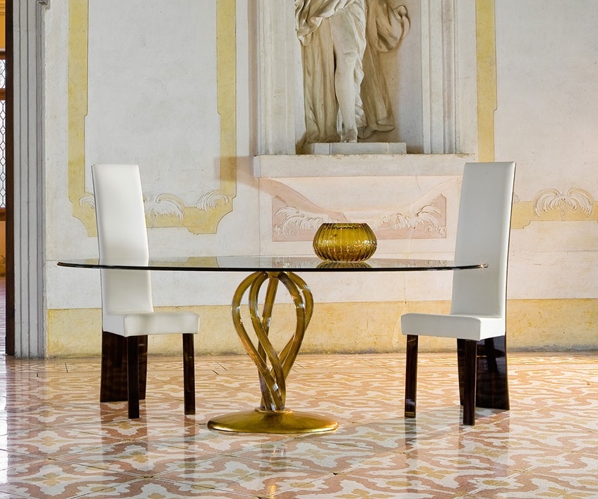 Dining table with base in Murano glass available in emerald green, blue, red or white with sandblasted finish or in white coated ribbed finish. Socle and details in gold or silver leaf. Glass top 15mm thick with OG bevel.