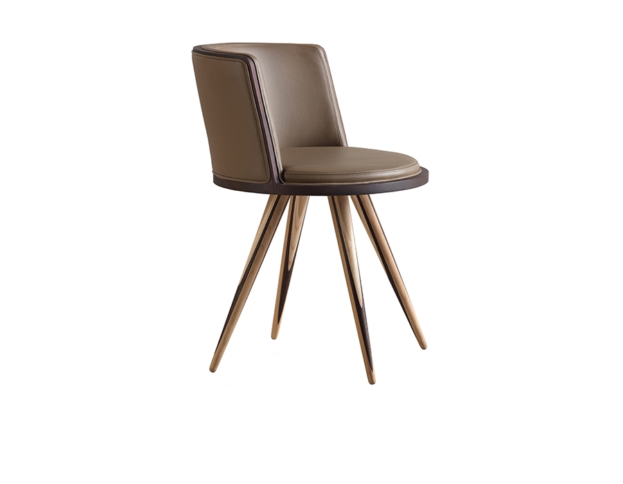 Carambola is a furniture collection skillfully obtained from the combination of different wood essences. Wengè, cherry and maple come together to give life to precious furniture line with a decisive character.Chair made of ash wood with turned legs in the shape of billiard cues made of cherry, maple and wengè wood. Upholstered back and seat.