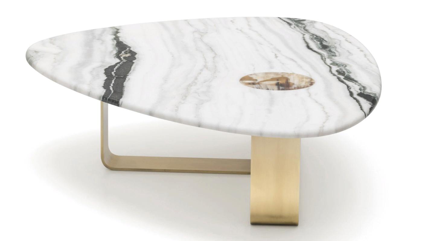 Tavolo basso in marmo Stelvio satinato con inserto in corno lucido. Struttura in metallo bronzato.