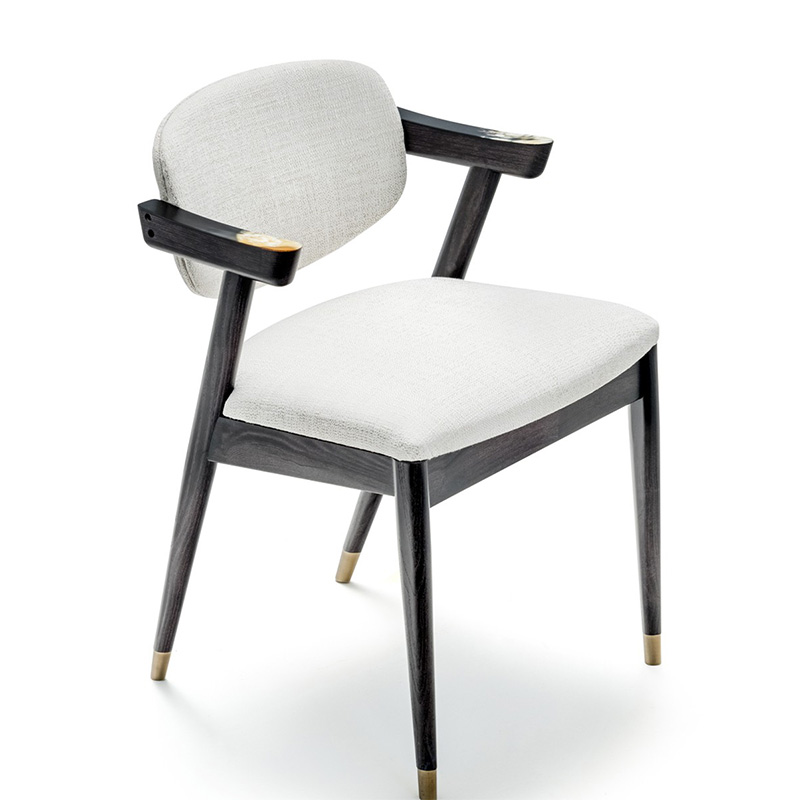 Sedia in tessuto Flash (cat. B), colore 4. Struttura in frassino tinto grigio con inserti in corno opaco e dettagli in ottone bronzato.