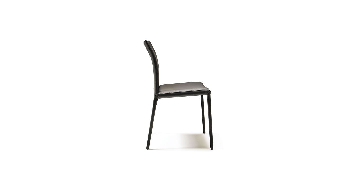 Upholstered chair with steel frame and covered in synthetic leather, synthetic nubuck, micro nubuck, or soft leather as per sample card. The cover is not removable.
