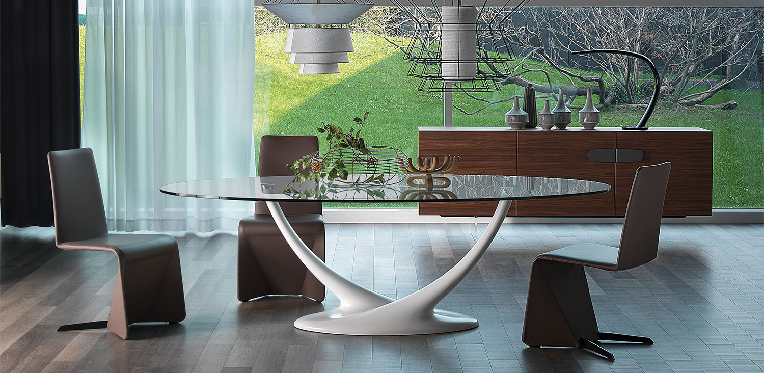 Стол с основанием из белого или черного полиуретанаТвёрдый. Столешница из прозрачного стекла 15 мм с матовым краем.