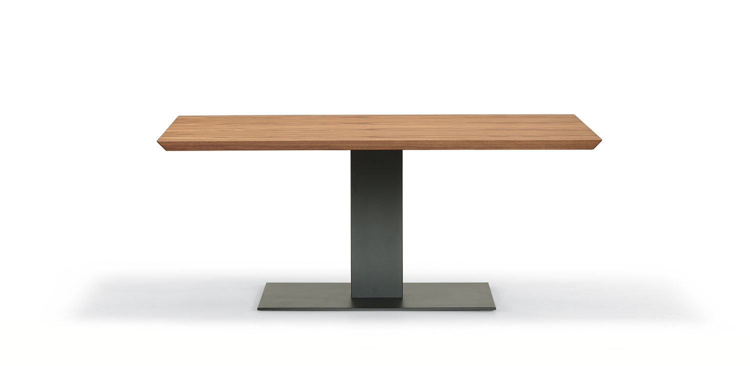 Table with base in white (GFM71) or graphite (GFM69) embossed lacquered steel or with satin stainless steel anti-marks base and polished stainless steel column. A version whit top in Canaletto walnut (NC), burned oak (RB) or natural oak (RN) with angled edges. S version with irregular solid wood edges.