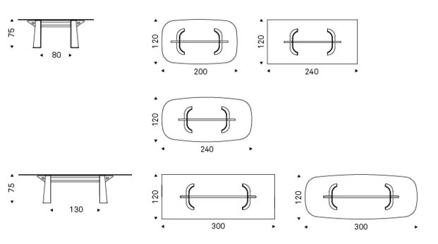 Table with 15mm clear curved glass legs. Top in 15mm clear, extra clear or extra clear glass with reversed bevelled edges. Central beam in solid Canaletto walnut (NC) or open pore ashwood stained in burned oak (frRB) or matt black (fr73).