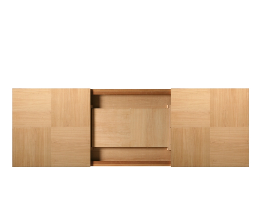 Strict, geometric lines are the hallmarks of the Scacchi collection. The collection has a checkerboard decoration obtained through the skillful combination of materials, of great visual impact. Extendable table made of cherry wood with fine "chessboard" veneer on the top, square legs and 2 internal extensions of 50 cm.